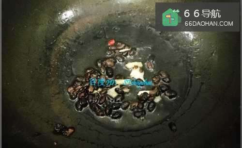 6将刚才焯上海的水倒掉,将锅清洗干净,沥干水渍,加入适量的油,加入辅料和豆鼓,小火将这些炒一阵,用勺子压碎一下豆鼓。