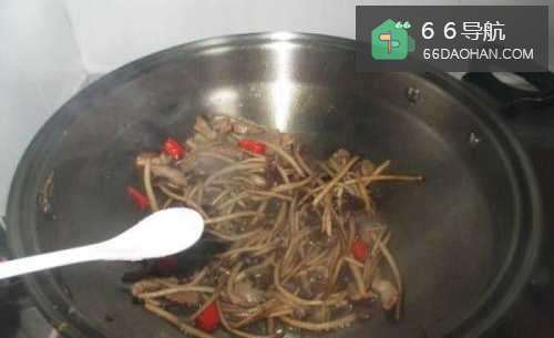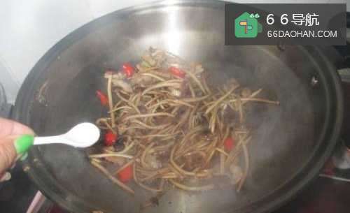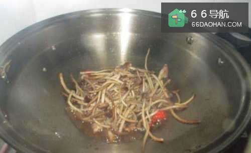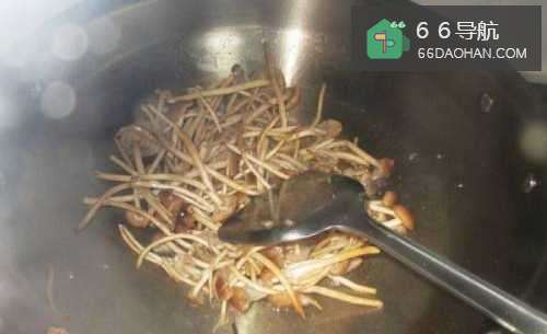5将茶树菇倒入炸制3分钟左右,盛出备用