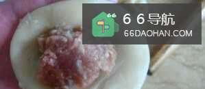 14按竖立的原样用手压扁,擀面杖擀圆后包入猪肉末,像包汤圆一样收口