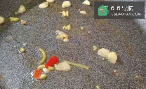 22、在锅中放入少许油,下切丁的辣椒与拍碎的蒜头入锅爆香