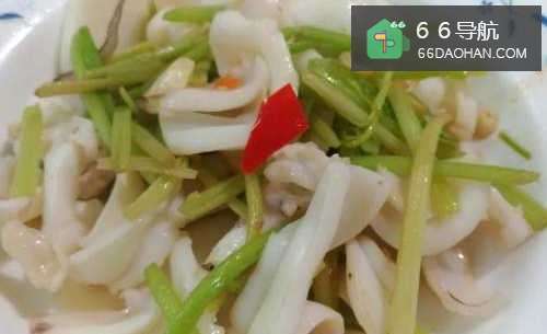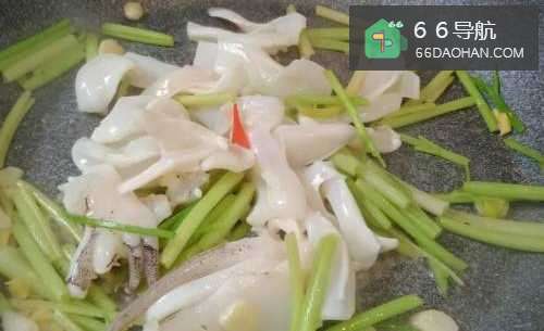 44、待芹菜已炒香,将鱿鱼下锅拌炒,待颜色变白且变熟卷曲时,加入适量盐调味及米酒去腥,再迅速拌炒均匀即可呈盘上桌