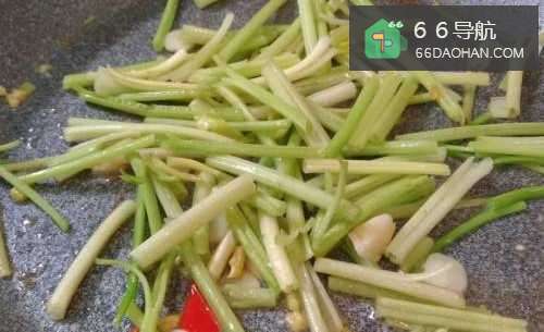 33、待蒜头及辣椒的香气飘出,即可将已洗净切段的芹菜下锅拌炒