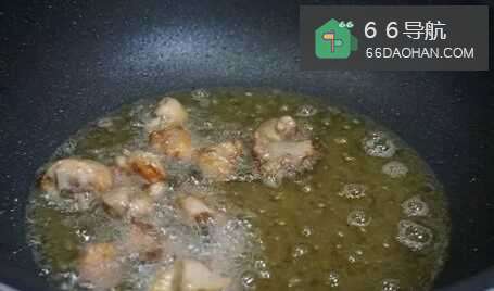 44.烧热加油,待油七成热,把腌制好的鸡块下锅炸到姜黄色,期间保持中火,一次油锅内不要放太多鸡块。