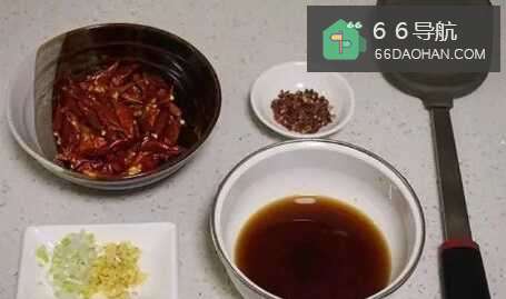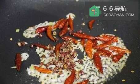 66.好后锅内放少许底油,放入葱、姜、蒜末爆香,接着放入花椒和干辣椒快速翻炒。