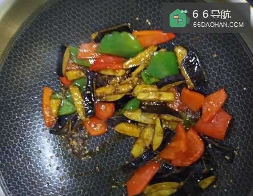 5锅中留底油,放入干辣椒、姜、花椒爆香,倒入调配好的酱汁,小火熬到汤汁浓稠,放入控干油后的茄条和青红椒,快速翻炒均匀,出锅前撒上白芝麻。