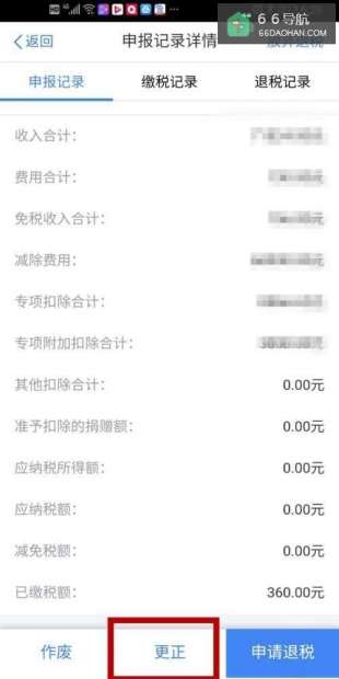 8、撤消后,点击【更正】,可修改申报记录;点击【作废】,可将申报记录作废;点击【申请退税】,可重新进行申报。
