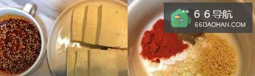 首先我们准备豆腐切片块,然后辣椒面,孜然粉,芝麻,蒜末放碗中