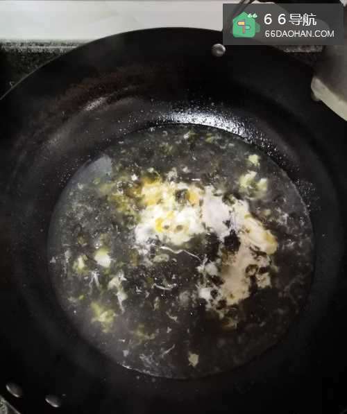 4加入鸡蛋,将蛋散开,加入少许的白砂糖,淀粉,虾粉,再加入适量的食用盐,等鸡蛋煮熟