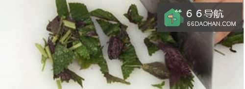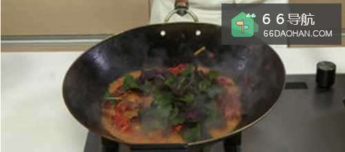 14 揭开盖,放入洗净的紫苏叶,炒至断生。