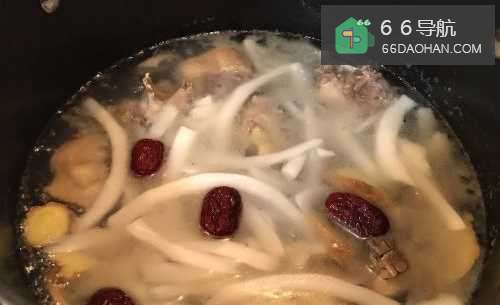 5待鸡汤煲了40分钟后,加入淮山块,大火煮开,改中火继续煮10分钟。