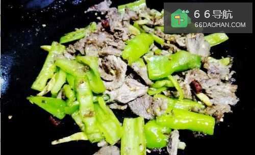 7翻炒一会,青椒熟了,放一点点食盐,喜欢吃孜然的还可以放一点点孜然粉,然后翻炒几下就可以出锅。