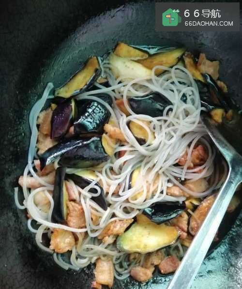 4加入少许生抽,老抽,料酒,再放入茄子翻炒片刻后放入粉丝,加一碗清水,没过粉丝即可。