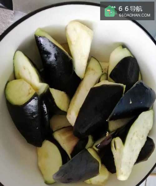 先将食材洗干净,茄子去蒂后滚刀切成如图所示的块状,加少许食盐腌出水分。