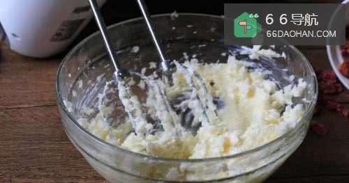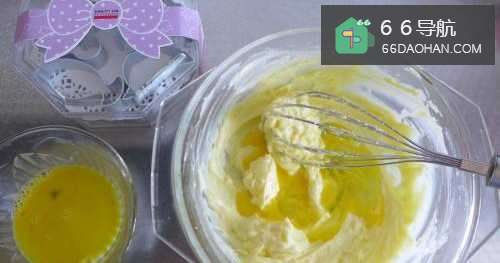 22、鸡蛋先打散成蛋液,分次少量加入黄油中,每次需迅速搅打至完全融合,方可继续加入,搅拌好的混合物呈乳膏状。