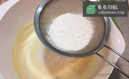 33、加入1/2过筛粉,1/2椰浆,用橡皮刮刀略翻拌均匀,再加入剩下的粉类、椰蓉及椰浆拌匀。