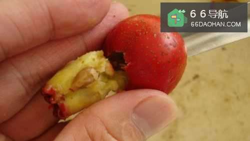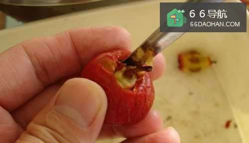 3然后用同样方法,在山楂上部的果柄处转圈插一周,将山楂籽与周围的果肉分隔开。