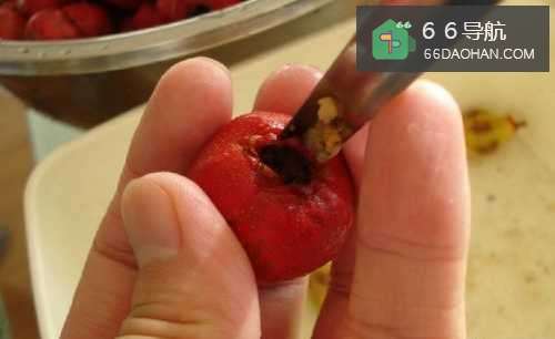 2找一个不锈钢匙,要那种匙把比较细又尖的,先在山楂的下部果蒂处插进果肉里,要贴着山楂籽插,沿着果蒂转圈插一周。