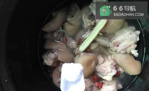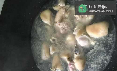 2烧一锅热水,放入两片姜,把猪脚放入,煮开,去掉血水。