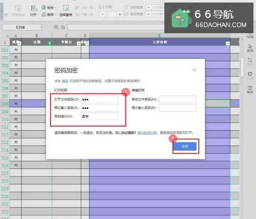 2在打开权限和编辑对象中输入【文件密码】、【密码提示】等信息,点击【应用】即可。