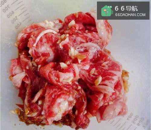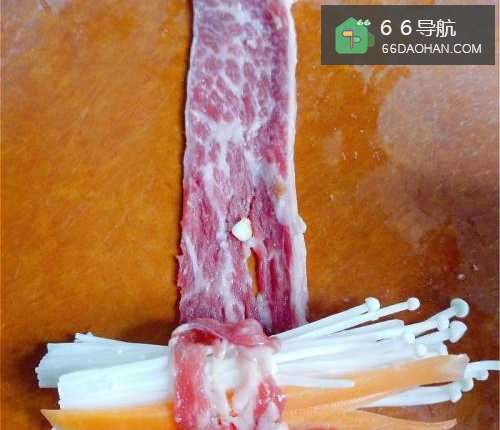 3牛肉片放平,放上一小束金针菇和适量的红萝卜条卷好。