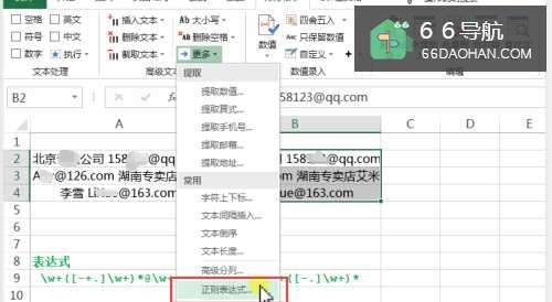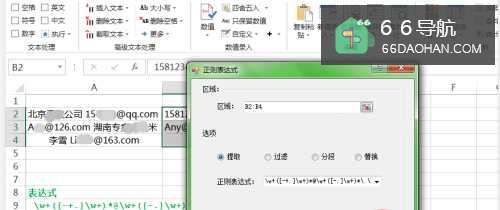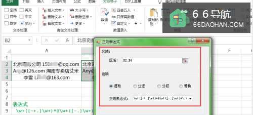 4选项选择【提取】,正则表达式输入w+([+.]w+)*@w+([.]w+)*.w+([.]w+)* 单击【确定】