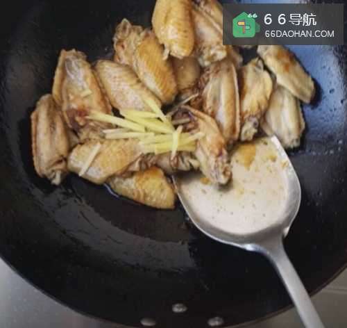 6最后我们再将鸡翅倒入锅里,把鸡翅炒到有红色,也不要炒的太的熟,火候控制好,小火就好,放入生抽,酱油,姜丝,料酒,