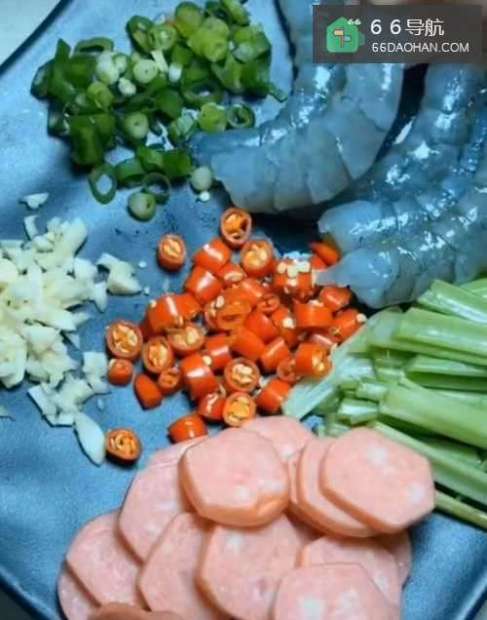 2把虾处理一下,把虾线去掉,然后把辣椒切成小碎片,香肠切成小片,葱蒜芹菜等配料备用。