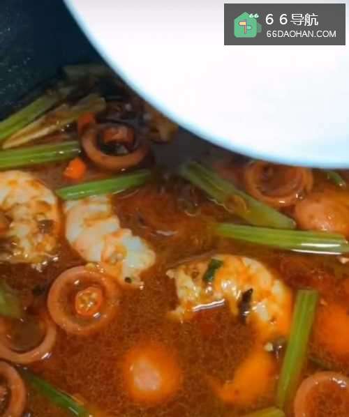 3锅里放油加入葱姜蒜,辣椒,豆瓣酱,再放入香肠,虾仁,芹菜进行搅拌