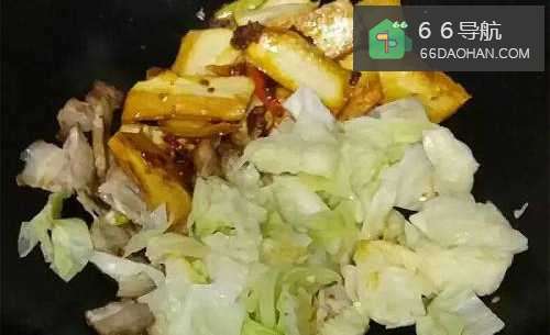 4同锅加点油,下蒜片、辣椒炒香,下猪五花肉片煎,猪肉变成金黄色后,加米酒,再加香干,加辣豆瓣酱、甜面酱炒匀,下卷心菜片,加酱油少许,调味,下蒜苗炒匀即可起锅。