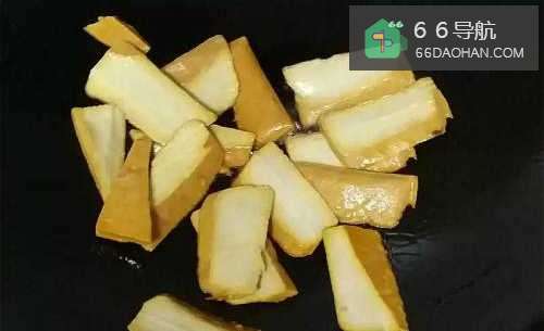 3起锅油热,下香干煎至稍微变金黄色后取出备用。