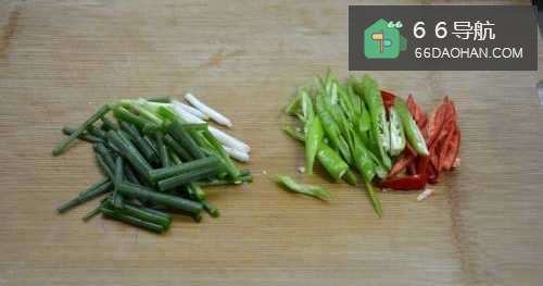 2香葱切寸段,青红辣椒一分二半,斜切成细丝;