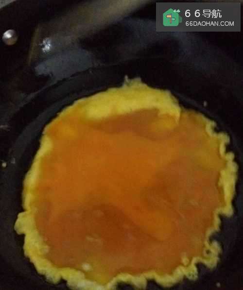 2放入菜油煎好后倒入鸡蛋,轻轻摆动铁锅。