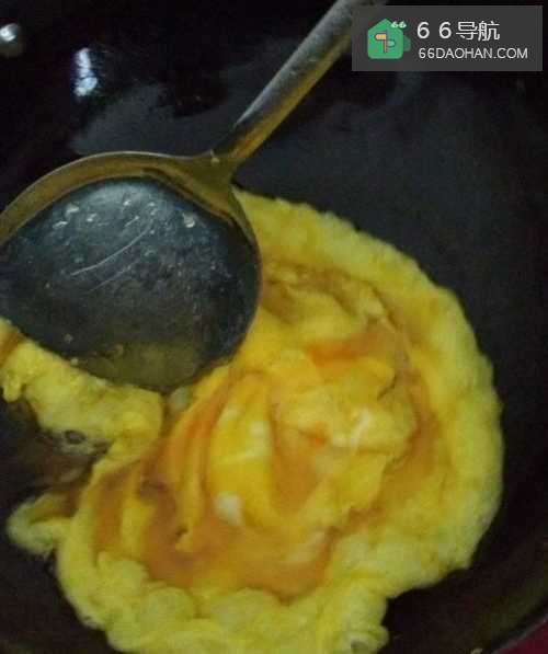 3再用锅铲轻轻拌,鸡蛋煎成饼状后起锅。