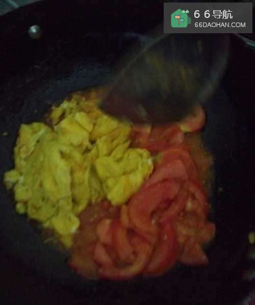 6倒入鸡蛋饼,和着番茄一起翻炒。