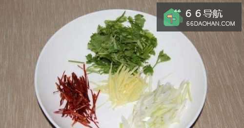 2干辣椒20克、姜丝10克、香葱20克、香菜20克切丝备用