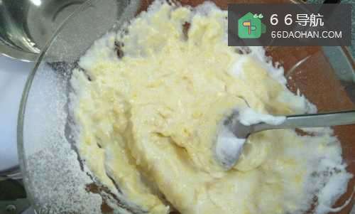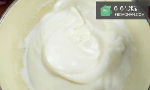 7到三分之一打发的蛋白,放入面粉与蛋黄混合物中,拌匀。