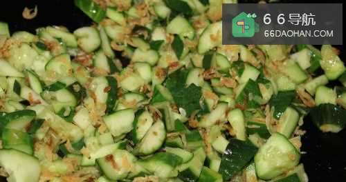 3锅中放油,油热后放入两片姜,然后放入干虾皮炒香,接着放入黄瓜翻炒。