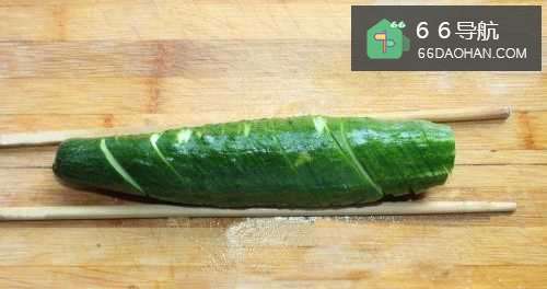 把黄瓜放在筷子中间,然后开始切黄瓜,我用了两种方法,第一种是先斜切一面,然后反过来继续斜着切。
