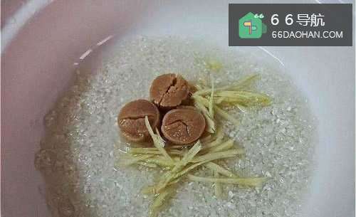 2干贝用清水加1大匙米酒浸泡半天,姜片切丝,砂锅中加入洗净的白米、清水和沥干水的干贝、姜丝,开大火煲滚。