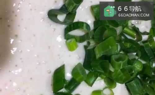 4再在醒发好的面糊里加上一把小葱花,少许精盐,充分搅拌均匀、备用。
