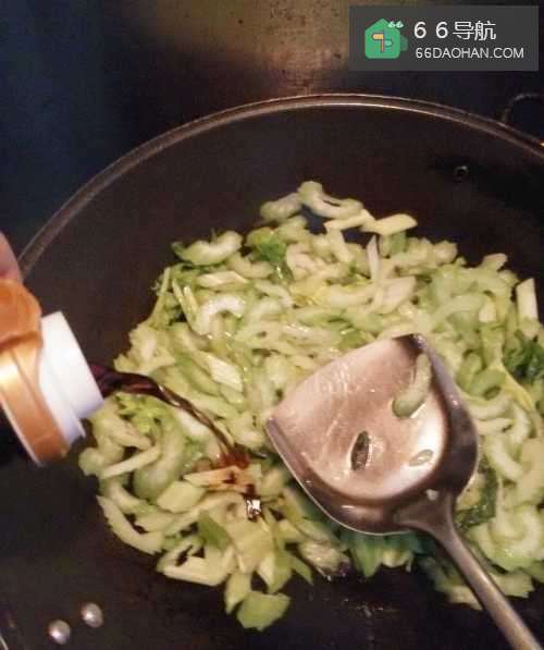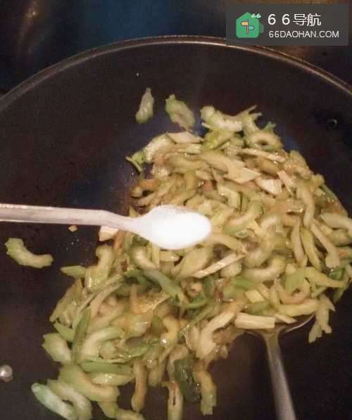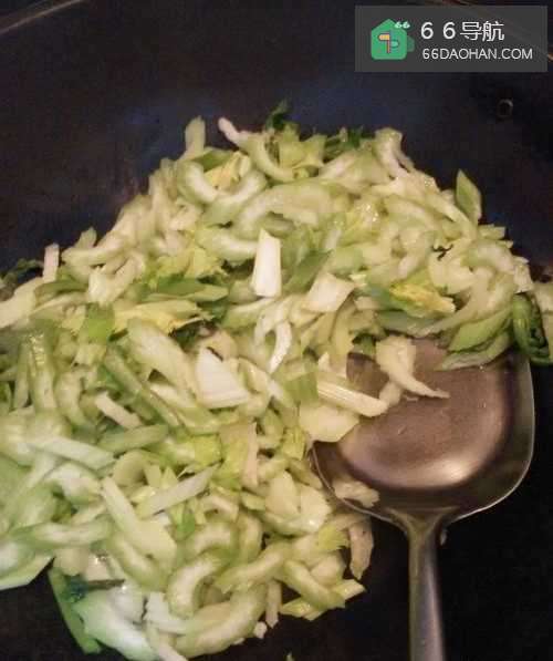 8将芹菜和火腿再炒几下,就可以出锅了,火腿不要炒时间长,化了就不好吃了。