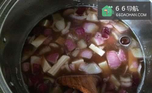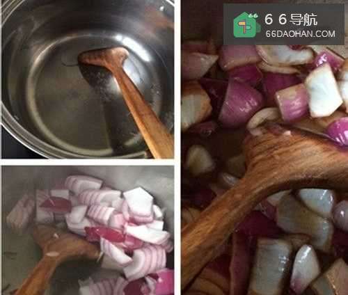 5锅内倒油,然后加热,带冒出白烟后,倒入洋葱丁,不停翻炒,炒出葱香,然后倒入白开水进行炖煮,也可以加入备好的火锅底料。