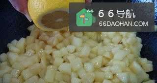 把苹果炒一会儿至颜色稍稍变深,加入派馅所用糖,继续中小火翻炒。