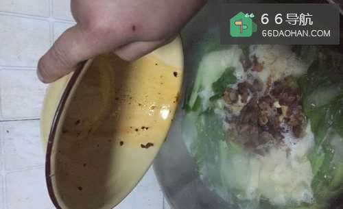 5锅中再一次沸腾后,倒入炒好的腊肉,加入适当的盐,一点点鸡精提鲜。