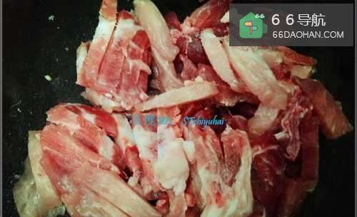 5锅洗净,沥干水渍,重新加入适量油,放入瘦肉先炸一阵,差不多炸熟。