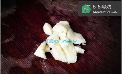 6准备少许蒜头,将其拍碎去皮切末;一会加入蒜末,倒入腌制的豆角,混合翻炒。