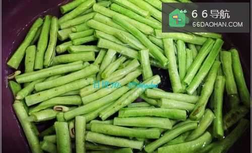 2将折好的长豆角放入水中清洗干净,打开电磁炉,加入适量水将其烧开,放入少许盐醋,将豆角倒入焯透,将其用漏勺捞出,放入碗中,加盐、酱油、料酒、醋等调味料拌匀腌制。