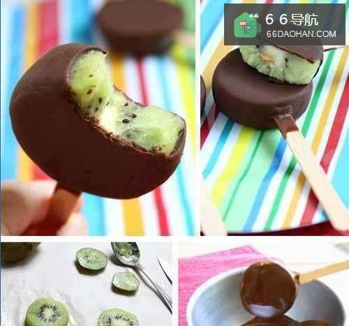 5巧克力水果雪糕!~嘿嘿,其实很简单啊,猕猴桃切片抹上巧克力冷冻一下下。
