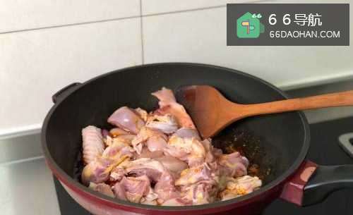 4在炒的干香的酱料里,加入鸡肉,大火快去翻炒断生。