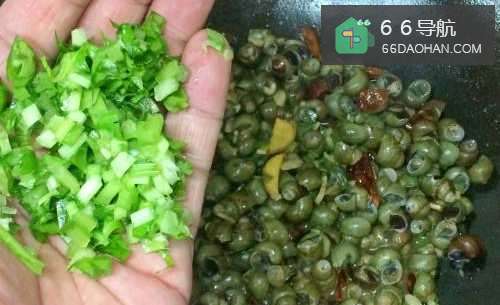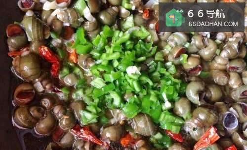 6然后倒入田螺翻炒几下,倒入线椒碎及调味汁进行翻炒要注意全程不盖锅盖。